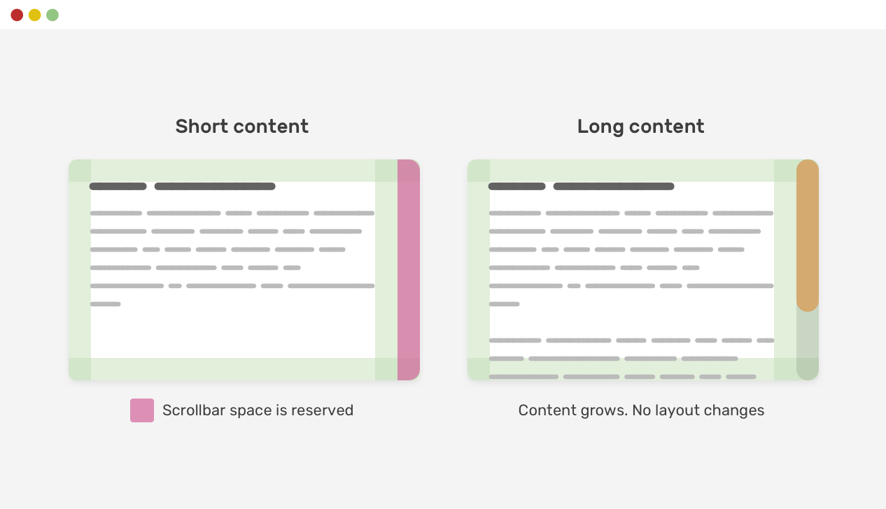 Another thing that is related to scrolling is the scrollbar gutter. Taking the previous example, when the content gets longer, adding a scrollbar will cause a layout shift. The reason the layout shift happens is to reserve a space for the scrollbar.